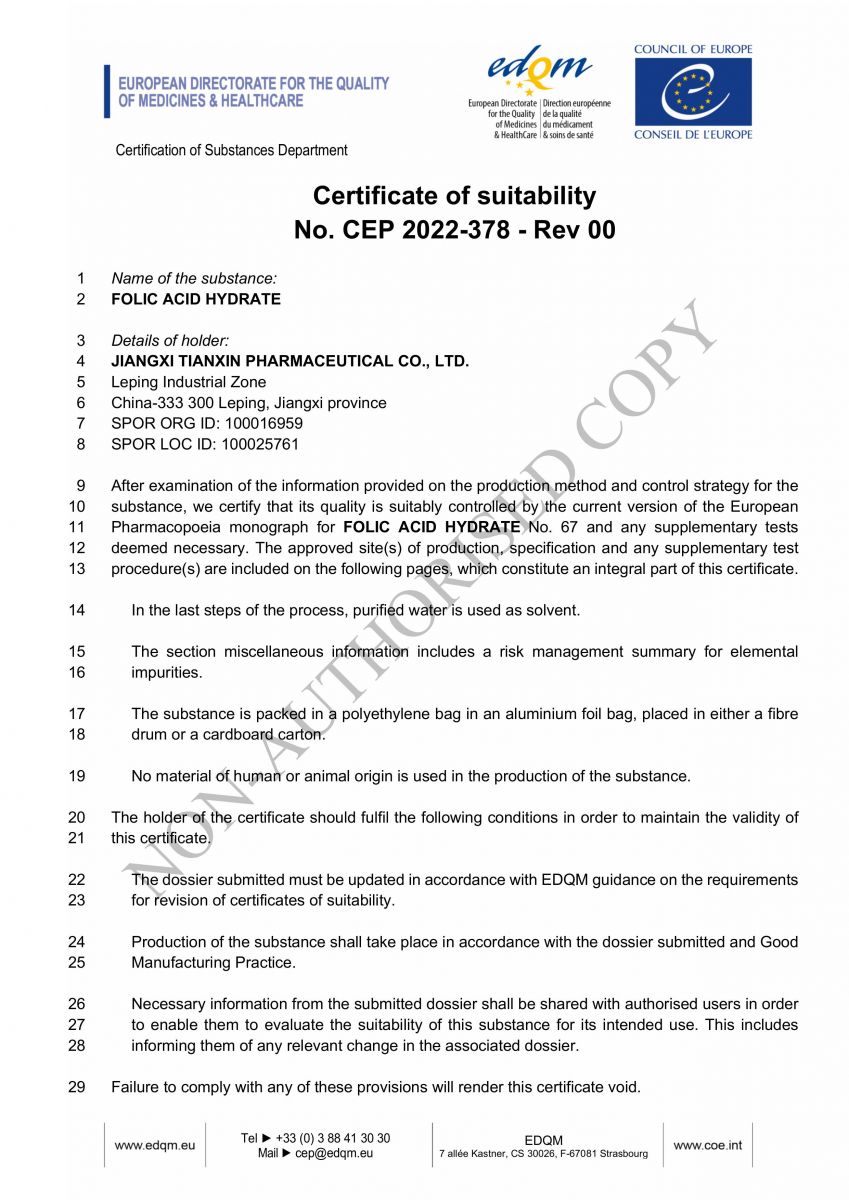 近日,天新药业传来喜讯,公司成功获得了欧洲药品质量管理局(EDQM)颁发的叶酸 CEP 证书(证书编号:CEP2022-378-Rev 00)。这一成果标志着天新药业在叶酸产品质量把控和国际市场准入方面取得了重大突破,进一步提升了公司在全球医药领域的竞争力。